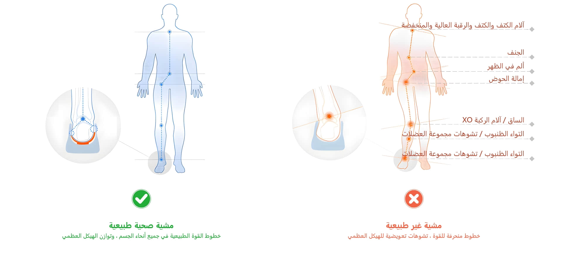 ذا كانت القدم غير صحيحة، فإن آلية حماية الجسم ستدفع المفاصل في الجسم إلى التعويض، بدءًا من الكاحل والركبة والورك والحوض والعمود الفقري، من الأسفل إلى الأعلى.