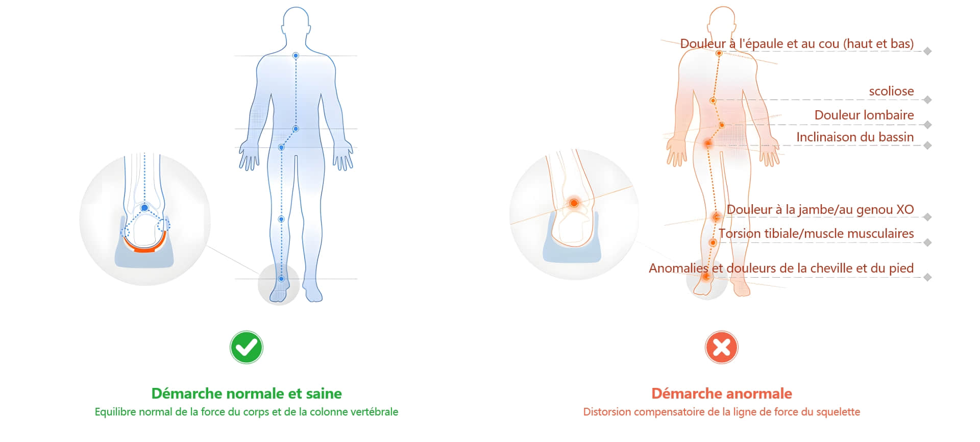Si le pied n'est pas correctement positionné, le mécanisme de protection du corps incitera les articulations à compenser. La cheville, le genou, la hanche, le bassin et la colonne vertébrale, de bas en haut, interviennent dans cette compensation.