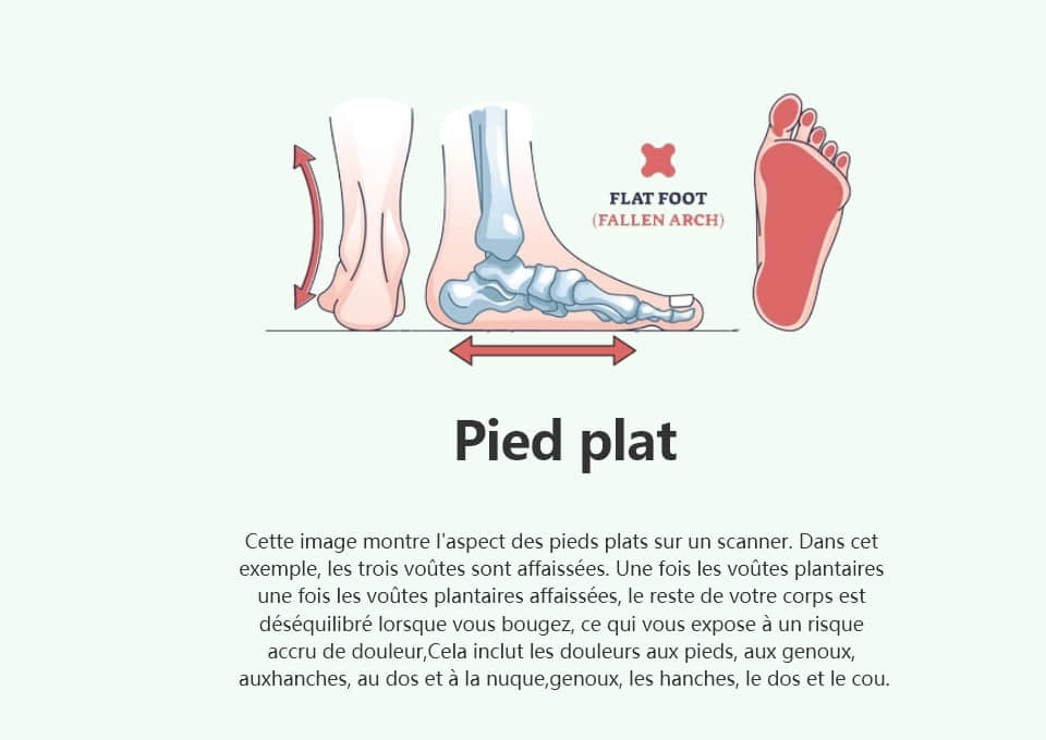 Vos pieds sont-ils en bonne santé ? Les pieds plats, les pieds pronateurs ou les déséquilibres des pieds peuvent entraîner des douleurs aux pieds, aux genoux, aux hanches, au dos et même aux épaules. Si vous envisagez des orthèses sur mesure spécialement conçues, un professionnel de la santé peut effectuer une numérisation de vos pieds pour vous montrer comment les déséquilibres des pieds peuvent entraîner des problèmes au niveau des genoux, des hanches, du dos et des épaules. La numérisation des pieds montrera comment les orthèses fonctionnelles peuvent aider. Après la numérisation des pieds, un rapport vous fournira un indice de pronation/stabilité, une évaluation des pieds et une évaluation physique.